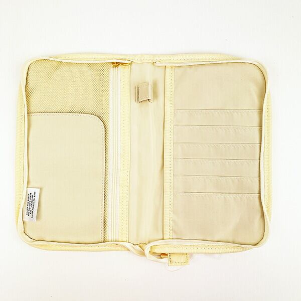 パスポートなどがさっと取り出せる仕切り以外に、カードが収納できるポケットが6箇所、チケット類も入る大きなポケットが1箇所、ファスナー付きポケットが1箇所と大容量☆真ん中にはペンホルダー付き◎クレジットカードや診察券、母子手帳など、大事なものを家で保管する際にも使えるアイテム◎キルティングのポコポコした感じも肌に優しく、絵柄もとってもかわいい♪