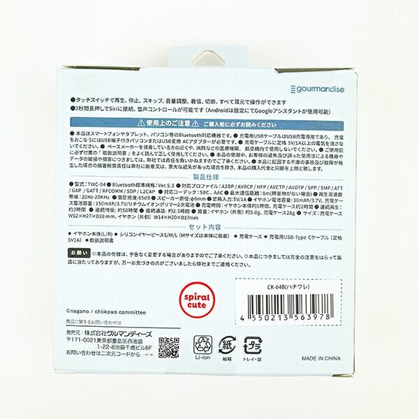 音漏れしにくいちいかわのカナルタイプのステレオイヤホンで♪。Bluetoothの無線技術を用いて8m以内であれば音楽再生・ハンズフリー通話が可能◎タッチスイッチで再生、停止、スキップ、音量調整、着信、切断、全て耳元で簡単に操作ができます♪お好きなキャラクターと一緒にお散歩や運動しませんか♪【製品仕様】型式:TWC-04 、Bluetooth標準規格:Ver.5.3 、対応プロファイル:A2DP/AVRCP/HFP/AVCTP/AVDTP/SPP/SMP/ATT/GAP/GATT/RFCOMM/SDP/L2CAP 、対応コーデック:SBC、AAC 、最大通信距離:8m(障害物がない場合) 、再生周波数帯域:20Hz-20KHz 、音圧感度:85dB 、スピーカー直径:6mm 、定格入力:5V/1A 、イヤホン電池容量:30mAh/3.7V 、充電ケース電池容量:150mAh/3.7V/リチウムイオンポリマー2次電池 、充電時間:イヤホン本体約1時間、充電ケース約2時間 、連続再生:約3時間 、連続待受:約50時間 、連続通話:約2.5時間【サイズ】充電ケース:H38×W52×D27mm、イヤホン(片側):H17×W14×D20mm【セット内容】イヤホン本体(L/R)、シリコンイヤーピース(S、M、L)※Mサイズは本体に装着※、充電ケース、充電用USB-Type、Cケーブル(定格5V1aA)、取り扱い説明書
