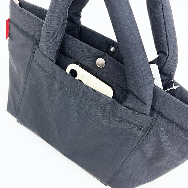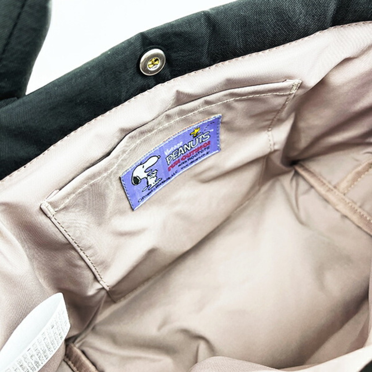 くしゃっとしたワッシャー加工のポリエステル生地を使用し、ムラ染シワ加工のような風合いのオシャレなスヌーピーのトートバッグです。クッション性があり、軽量で普段使いにちょうどよいサイズの「デリ」。長財布、スマホ、ボトル、エコバッグなど、必要なモノがひと通り収まり便利◎口元はボタン付きで背面のポケット付きも嬉しいポイントです。※洗濯の際はネットに入れて弱水流で洗ってください。
