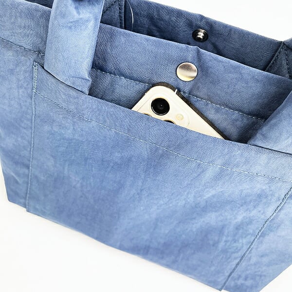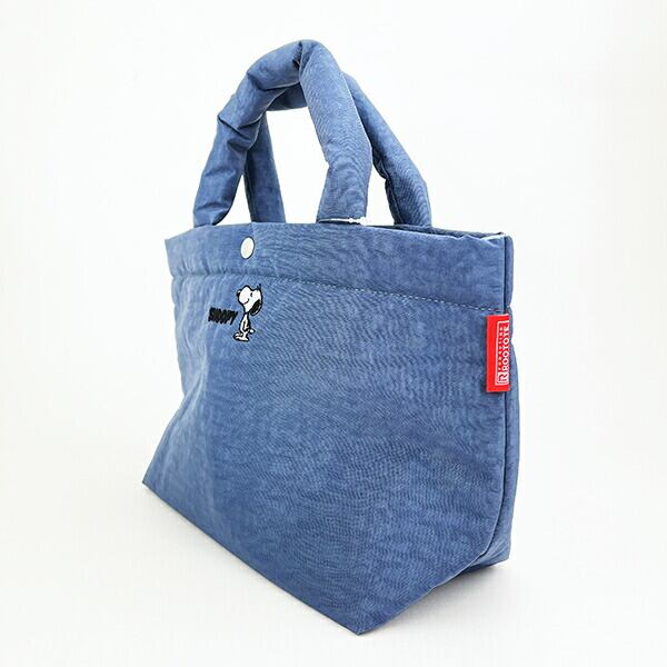 くしゃっとしたワッシャー加工のポリエステル生地を使用し、ムラ染シワ加工のような風合いのオシャレなスヌーピーのトートバッグです。クッション性があり、軽量で普段使いにちょうどよいサイズの「デリ」。長財布、スマホ、ボトル、エコバッグなど、必要なモノがひと通り収まり便利◎口元はボタン付きで背面のポケット付きも嬉しいポイントです。※洗濯の際はネットに入れて弱水流で洗ってください。