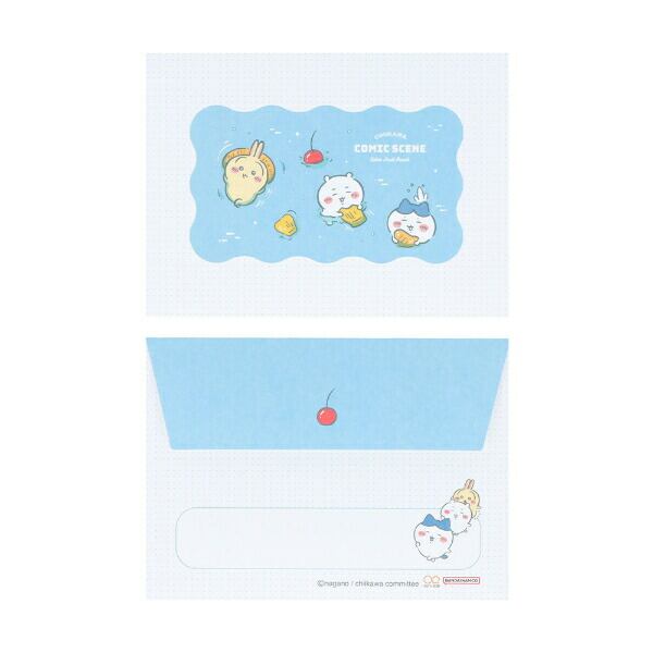 ちいかわの可愛いミニレターセットです。ちょっとしたメッセージにぴったりなミニサイズ☆便箋は裏表で絵柄がちがうよ!爽やかなカラーリングでお宝さがしの冒険やプールのようなフルーツポンチなど夏休みのようなストーリーをメインに描かれたシリーズでとってもキュート♪ちいかわ好きには嬉しいデザインかも☆ぜひ同シリーズのお好きなアイテムを揃えてみてください♪【セット内容】便箋×15枚、封筒×5枚、【サイズ】便箋:11cm×8cm、封筒:6.4cm×9cm