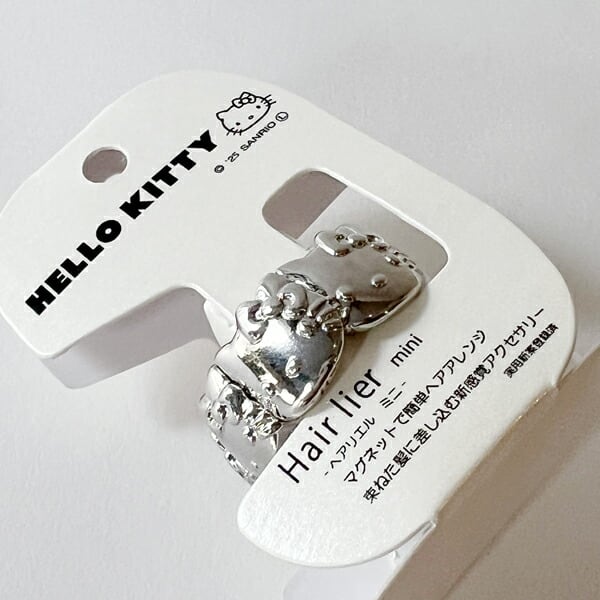 キティちゃんの大人カワイイヘアアクセサリーです。留め具はワンタッチで装着できるマグネット。裏側はモビロンゴムでメタルパーツがしっかりとつながっています。簡単に髪を束ねて装着すればすぐにオシャレヘアに変身♪