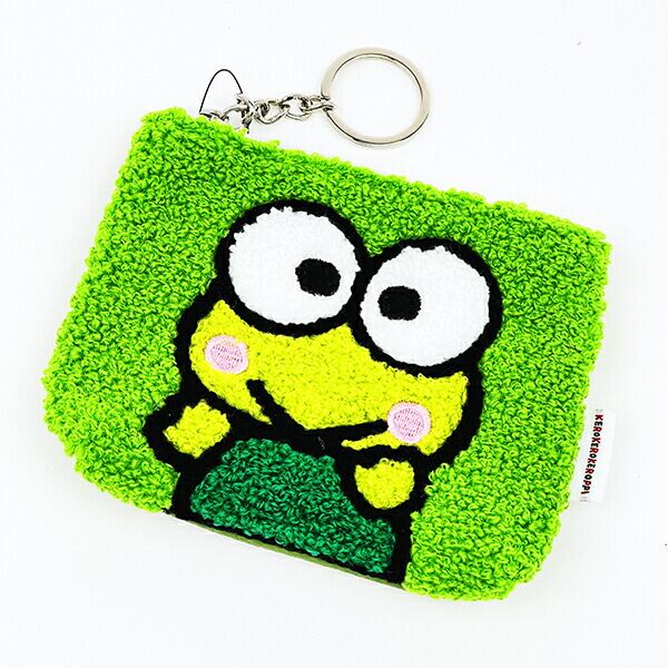 ケロケロけろっぴのキーホルダー付きサガラポーチです。サガラ刺繍は一本の糸をかぎ状の針ですくいあげながら縫う手法。毛糸をつかったふわふわとした感触の高級な立体感のあるデザインが可愛いです♪メイク用品やお菓子、小物など入れるのにぴったりなのでバッグの中の収納に便利☆バッグに入れておくだけでも可愛いのでおすすめです♪キーホルダー付きなので推しキャラクターのチャームを付けて自分だけのオリジナルポーチに出来ちゃいます☆彡