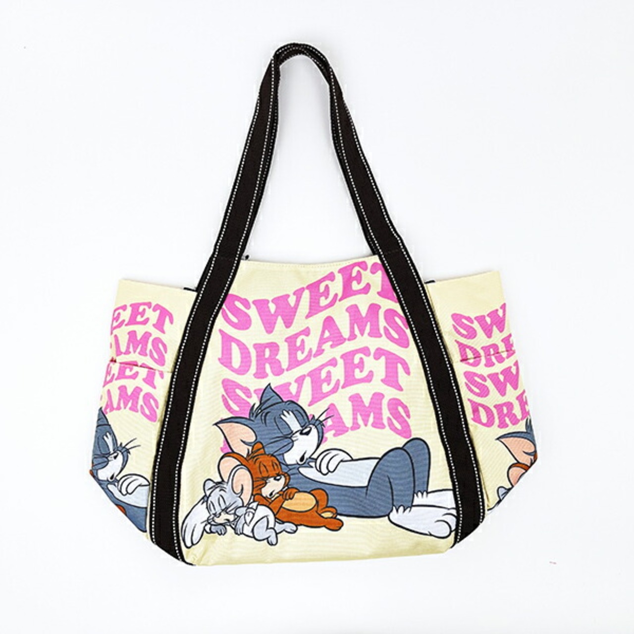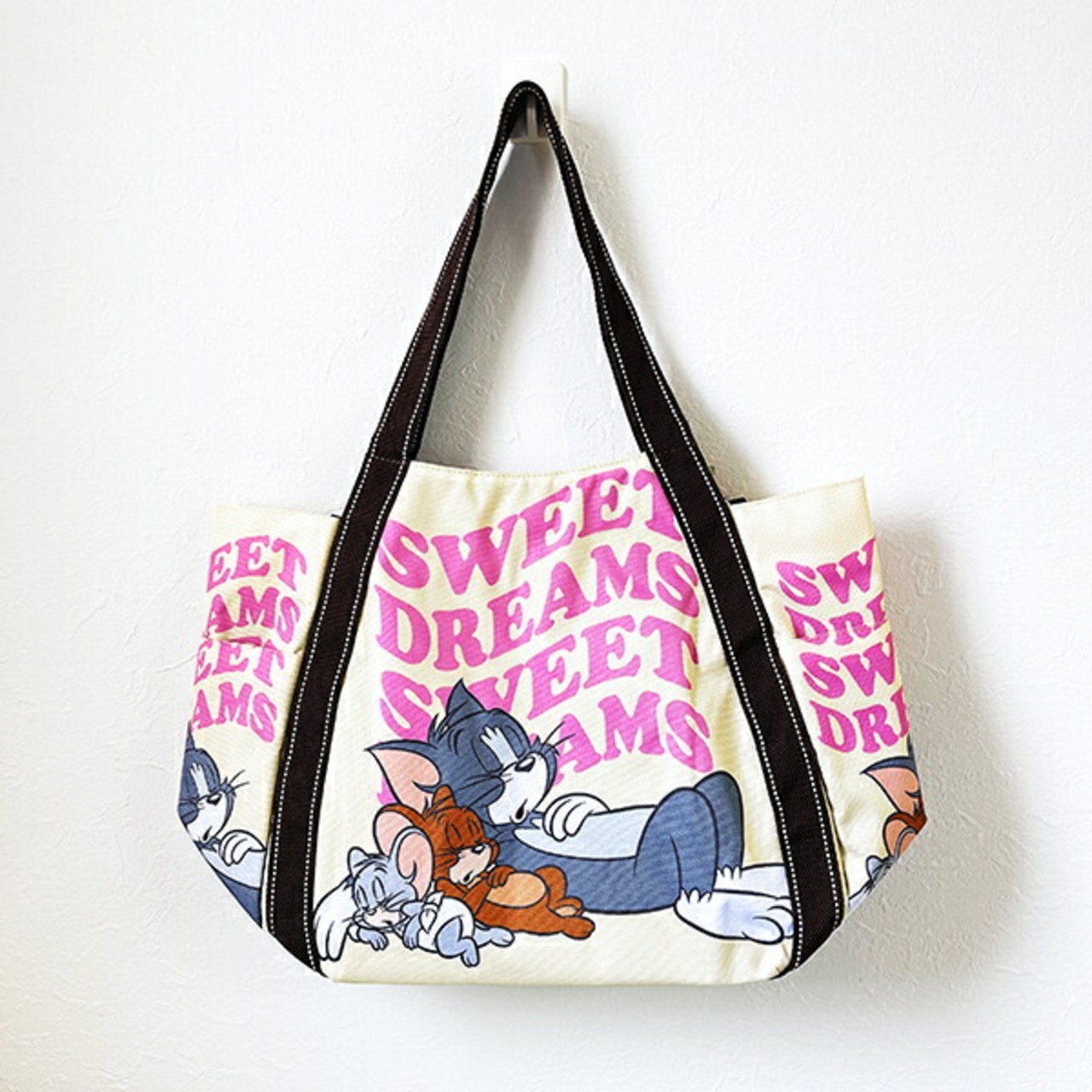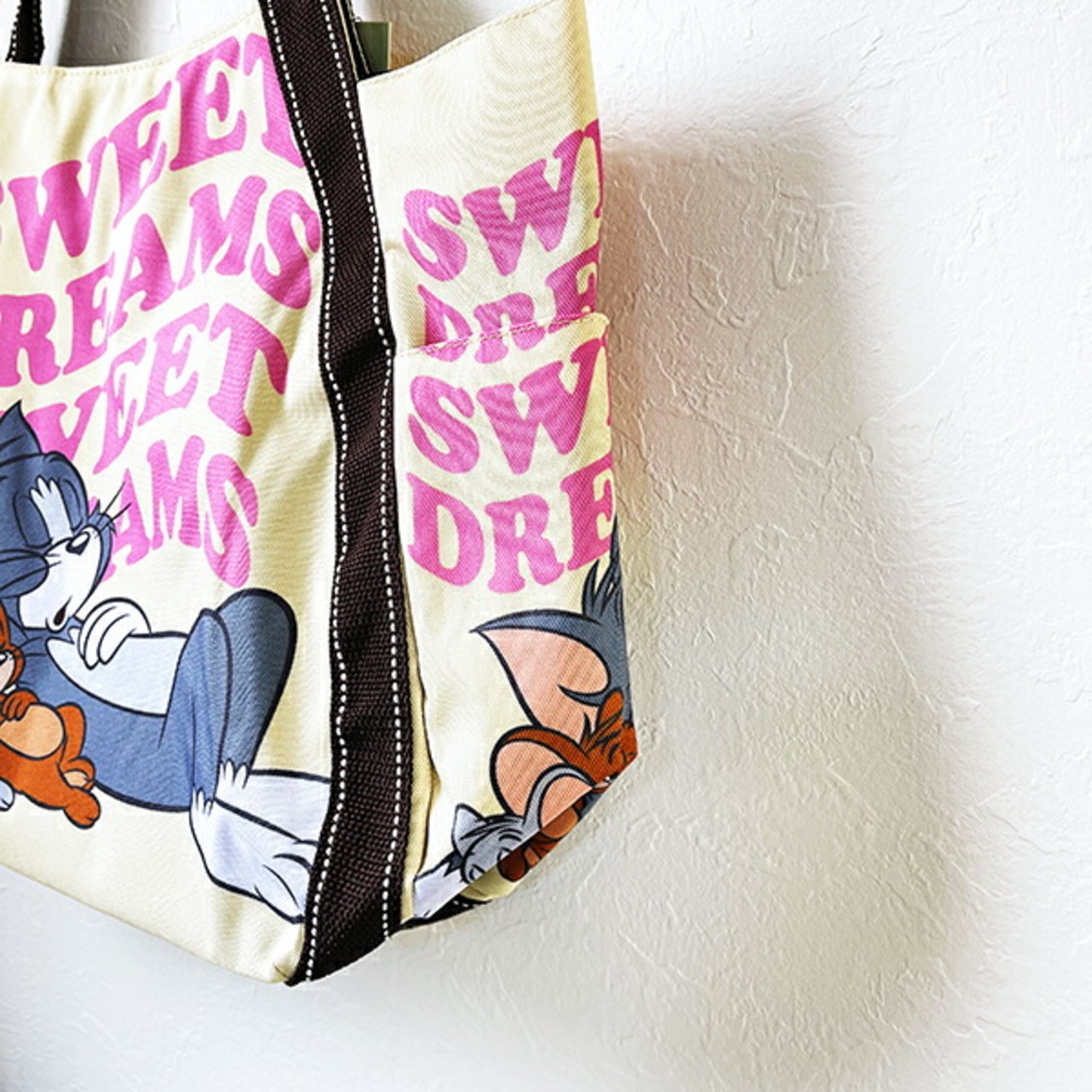 トムとジェリーのバルーントートバッグです。キャラクター達がリラックスしているデザインがキュート♪大容量なので荷物の多いママさんにもおすすめです☆両脇にポケットがついていて飲み物を入れたり、すぐに取り出したいものを入れるのにぴったり!通勤・通学やマザーズバッグとして大活躍間違いなしのアイテムです♪【持ち手:55.5cm】