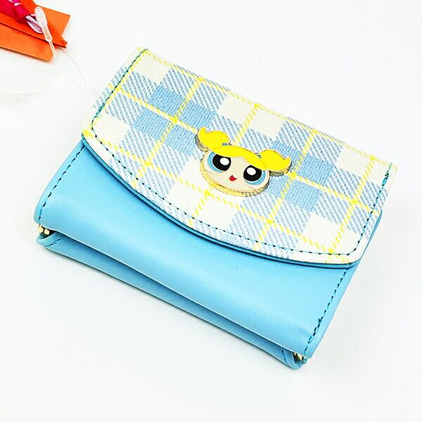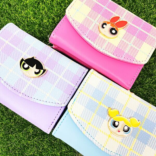 パワーパフガールズのミニウォレットです☆パステルカラーのチェック柄と、キラッと輝くキャラクターモチーフが可愛い♪お札・カードも収納できて、コインケース部分は小銭が取り出しやすいがま口仕様です。 お札入れ:1カードポケット:5コインケース:1