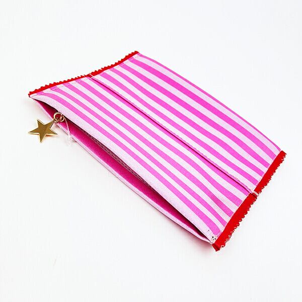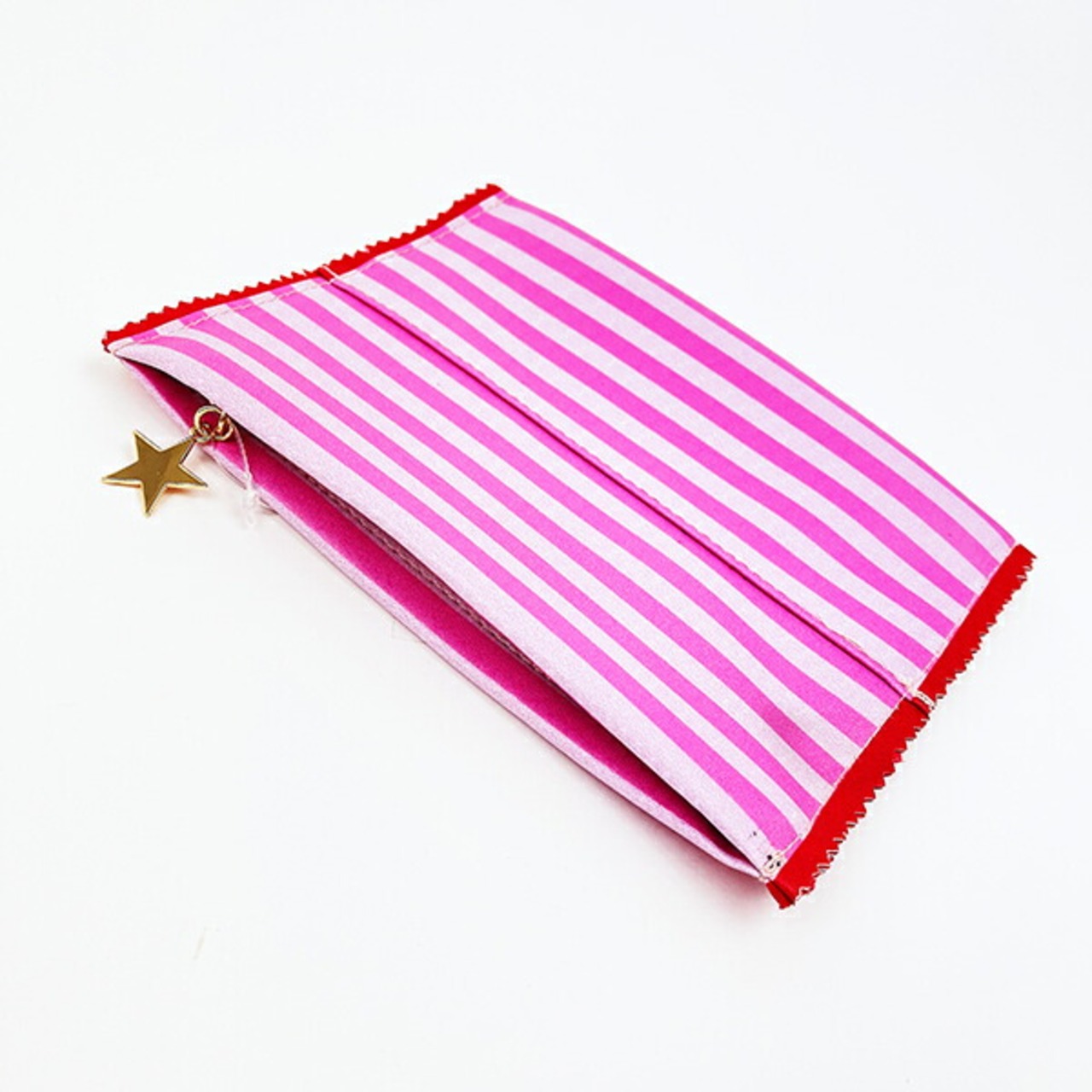 お菓子のパッケージをイメージしたキュートなポーチです♪大き目のフラットポーチなので、ペンケースや化粧ポーチ、色んな用途で使用できる☆彡可愛いデザインなのでプレゼントに送ってみませんか♪