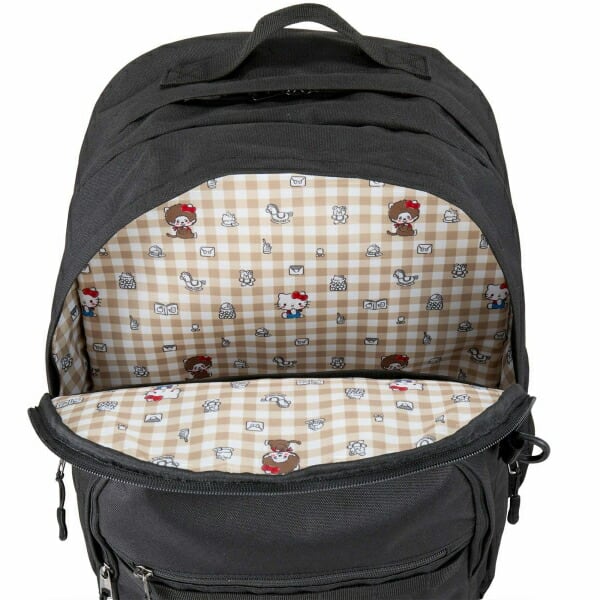 ハローキティ×モンチッチの文字が刺繍されたリュックサックです♪前面にはキーホルダー等を引っ掛けることのできるキーホックがついています♪片側側面にはDカンもついているので、お好きなキーホルダーをつけることができます♪内装もハローキティとモンチッチがプリントされていておしゃれ。可愛いだけでなく機能性も抜群!メイン収納は2ルームに分かれており、荷物を仕分けして収納することが可能◎30Lの大容量で収納力抜群。A4サイズのノートもすっぽり収納できます。ノートPCやタブレットを入れるのに便利なクッションポケットも付き◎サイドには500mlペットボトルを入れられるメッシュサイドポケット付き。背面部分はメッシュ&クッションで背負い心地も快適◎