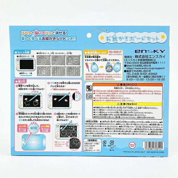 ちいかわのお絵かきボードセットです!楽しく学べるお絵描きシート付となっており、五十音から数字、ちいかわも上手に書けちゃうシート(6枚)☆描いたものはボタンを押すとまとめて消せます。※一部分だけを消す事は出来ません。【セット内容】お絵かきボード…1個、専用ペン…1個、お絵かきシート…6枚、画面サイズ(約)123×176mm(8.5インチ)電池:コイン電池(CR2025)使用※電池は付属しておりません