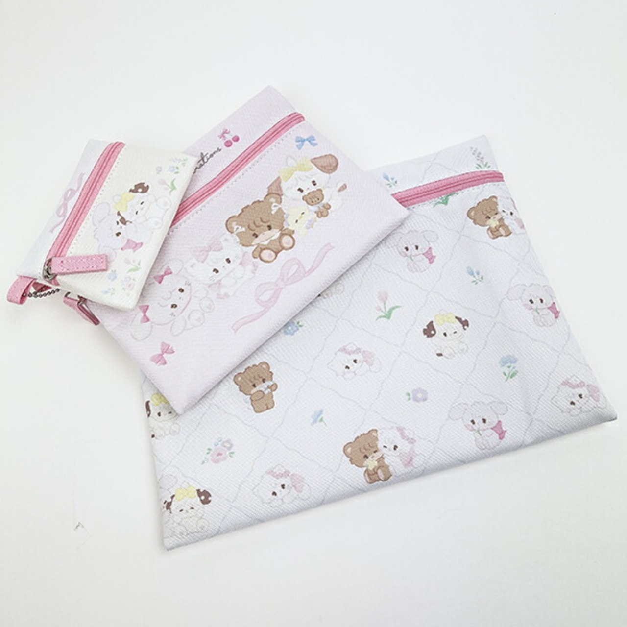 かわいくてしっかりと使える3連ポーチです。L・M・Sの3サイズがセットになっており、用途に合わせて使い分けができるアイテムです。【サイズ】Lサイズ(総柄):W270 × H210mm、Mサイズ(フロントプリント):W190 × H140mm、Sサイズ(フロントプリント):W110 × H80mm