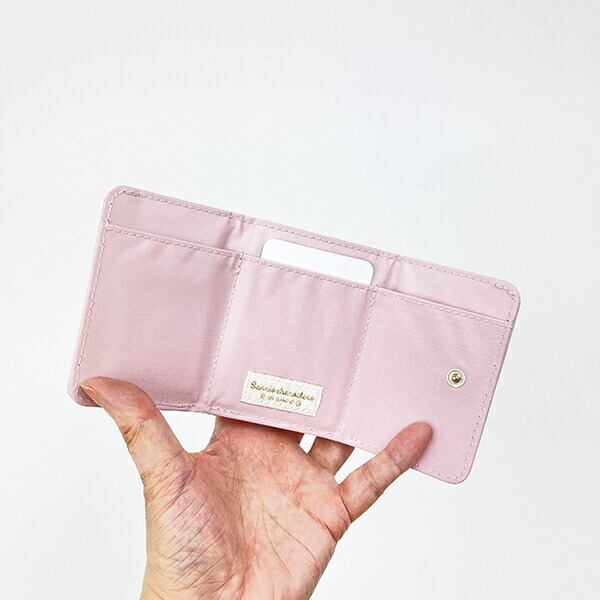 三つ折りタイプで小さなかばんにもスッポリ収まるミニウォレット♪大きく開いて取り出しやすいがまぐちコインケース、カードホルダーなど使いやすも◎リボンのメタルパーツとキャラクターがかわいい♪