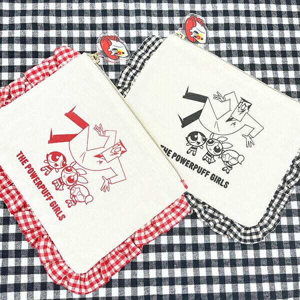 パワーパフガールズのフリルポーチです♪コスメやステーショナリーを入れるのにちょうどいいサイズ◎フリルでふちどりされたデザインに、電話の引手がポイントです♪