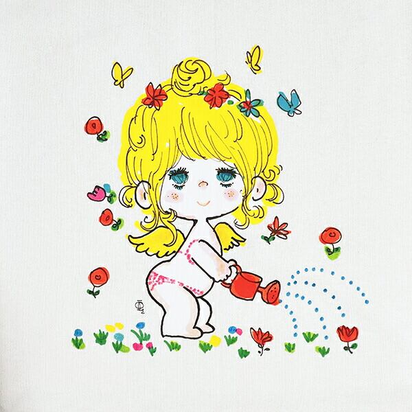 水森亜土の可愛いらしいデザインのコットンTシャツです。天使の女の子×お花デザインでとってもキュート♪しっかりした生地で耐久性も◎防寒・吸水性にも優れているので1年中着用いただけるTシャツです☆彡【サイズ】身丈:69.5cm、身幅:47cm、肩幅:44cm