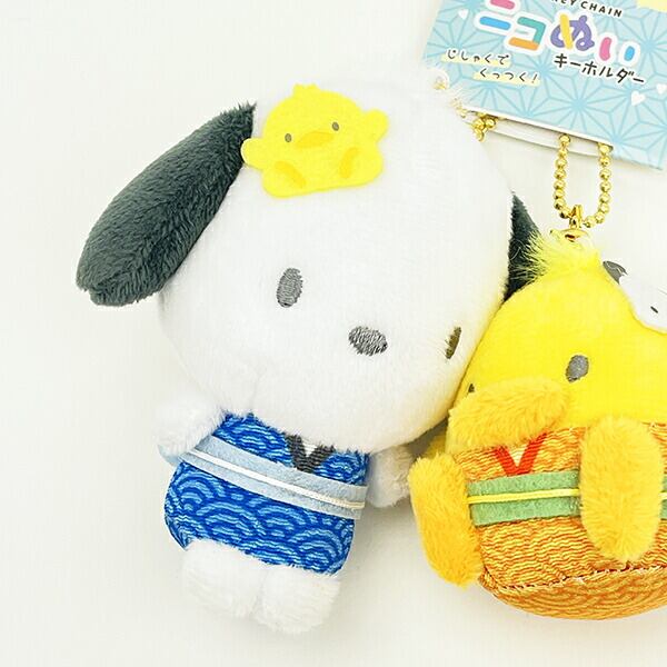 ポチャッコとピヨの仲良しマスコットです!磁石でほっぺがくっつく、おソロキーフォルダーのニコぬい♪浴衣とお面を被って夏バージョンです!