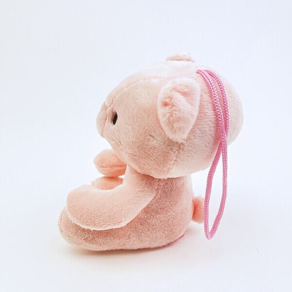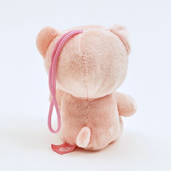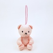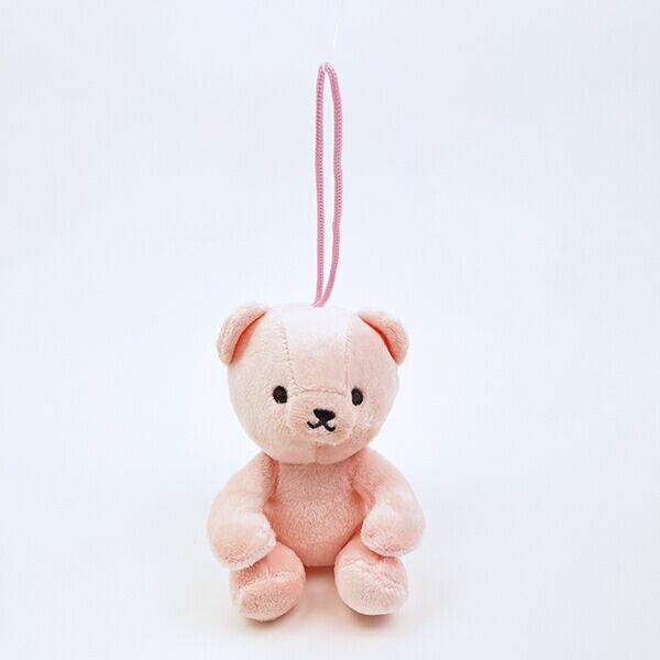 推しハグベアのサラッとタイプです。優しい手触りにすべすべな見た目がカワイイ♪首にヘアゴムをつけて缶バッチをつけると、推しをギュっとしてくれるデザインです。紐があるのでバッグに付けられてうれしい◎