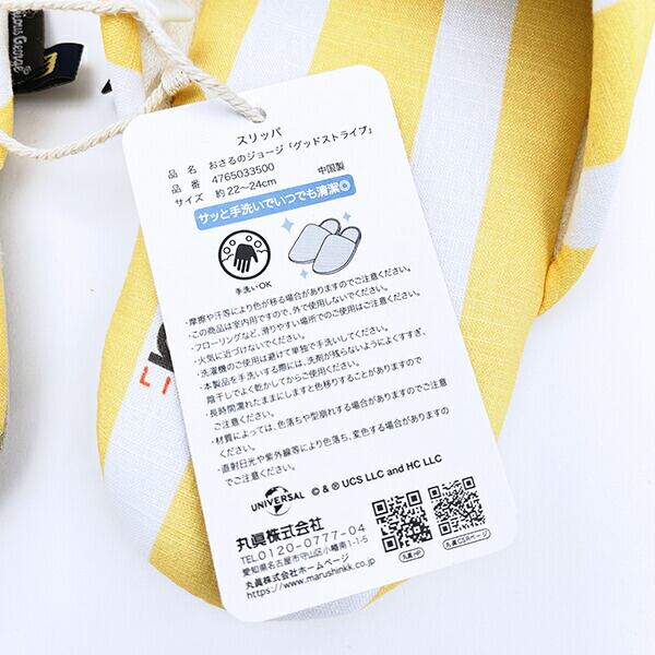 黄色いストライプが目を引く、おさるのジョージのスリッパです♪ふんわりとした履き心地で、足元を優しく包みます☆彡普段使いにはもちろん、ゲスト用やプレゼントにもおすすめ♪【サイズ:約22〜24cm対応】