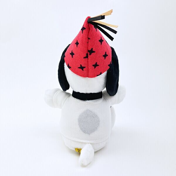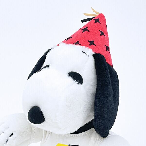 PEANUTS75周年特別デザインのスヌーピーぬいぐるみです。パーティーハットと75周年Tシャツを着てお祝いムードなのがとってもキュート♪ぜひ同じシリーズの仲間を並べて一緒に周年をお祝いしてみてください☆彡