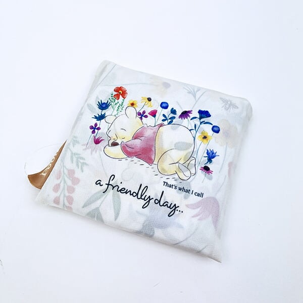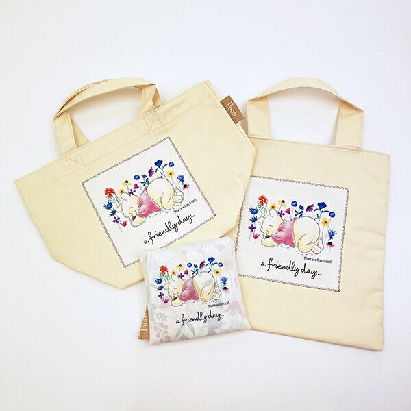 くまのプーさんの持ち運びに便利なコンパクトに収納できるエコバッグです。プーさんとお花たちがデザインがとってもキュート♪回収したペットボトルから作られたポリエステル繊維の再生ポリエステルを使用しています。大容量でスーパーでのお買い物などにぴったり☆便利な収納袋付きが嬉しいポイントです♪じゅわっとした優しいカラーで大人でも使いやすいバッグです☆彡