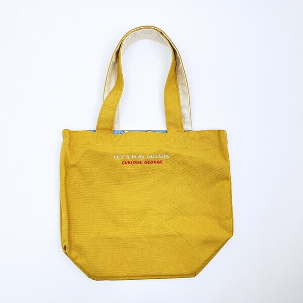 おさるのジョージがわんちゃんたちと楽しそうなイラストがあるランチバッグです♪中の裏地もわんちゃんたちの柄でポケットもついています♪