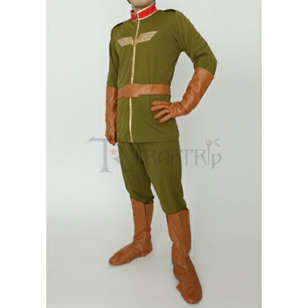 手軽に変身!キャラクターコスプレを楽しもう!『機動戦士ガンダム』のジオン公国軍制服(下士官ver.)です!ジャケット・パンツは、伸縮性に優れた生地を使用することでサイズに汎用性を持たせています。ジャケットはフロントファスナー開きで、着脱しやすくしています。胸のモチーフは、合皮に刺繍による縁かがりを施すことで立体的に仕上げています。袖口は設定に合わせて、赤いカフスが付いています。ウエストベルト・グローブ・ブーツカバーには光沢を抑えた合皮を使用しています。ウエストベルトは、マジックテープで簡単に着脱でき、サイズ調節が可能です。パンツのウエストはゴム仕様で、サイズに汎用性を持たせています。また、裾口にゴムが付いており、足を通すことで裾がまくり上がるのを防止し、シルエットを保つ仕様にしています。ブーツカバーは、内側ファスナー開きで着脱しやすくしています。お手持ちの靴にかぶせてご使用ください。ハロウィン、学園祭、新年会、忘年会様々なシーンで活躍間違いなし!?【セット内容:ジャケット・パンツ・ウエストベルト・グローブ・ブーツカバー】【サイズ目安:身長:170 チェスト:89〜96 ウエスト:73〜80 ヒップ:89〜96(cm)ジャケット仕上がり寸法…着丈:約75.5(cm)パンツ仕上がり寸法…股下:約80(cm)ブーツカバー仕上がり寸法…ブーツ丈:約45 足のサイズ:約25〜27(cm) 】※ウエストベルト、グローブ、ブーツカバーに使用している合皮は、水洗いいただけませんのでお手入れの際はご注意ください。汚れた場合は、取り扱い絵表示に従い、洗濯ください。濡れたままの放置や、漂白剤及び漂白剤入りの洗剤を使用すると、変色する場合がございますので避けてください。色落ちや色移りする場合がございますので、他のものとは別に洗ってください。水濡れや着用時の摩擦などにより、色落ちや色移りする可能性がありますので、十分ご注意ください。強く引っ張ったりこすったりすると、縫い目がほつれることがありますので、避けてください。高温多湿な場所での保管は合皮の劣化を早めたり、色移りの原因になります。通気性がよく、湿気のない、直射日光を避けた場所での保管をお願いします。本商品は仮装用の衣装となります。着用時の運動は事故の原因になりますので、ご注意ください。パッケージの写真・イラストと商品は若干異なる場合がございますので、ご了承ください。