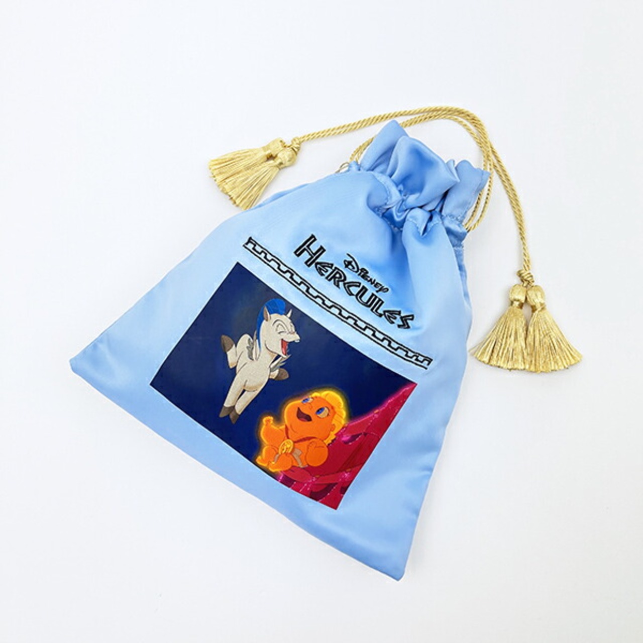 映画のワンシーンからピックアップしたアートを使用し、ヘラクレスの世界観たっぷりな巾着です。光沢のある生地とゴールドのタッセルを使用することで高級感◎裏地付きなのも嬉しいポイント★コスメやトラベルグッズなど、小物をまとめて収納するのに便利なサイズ感◎