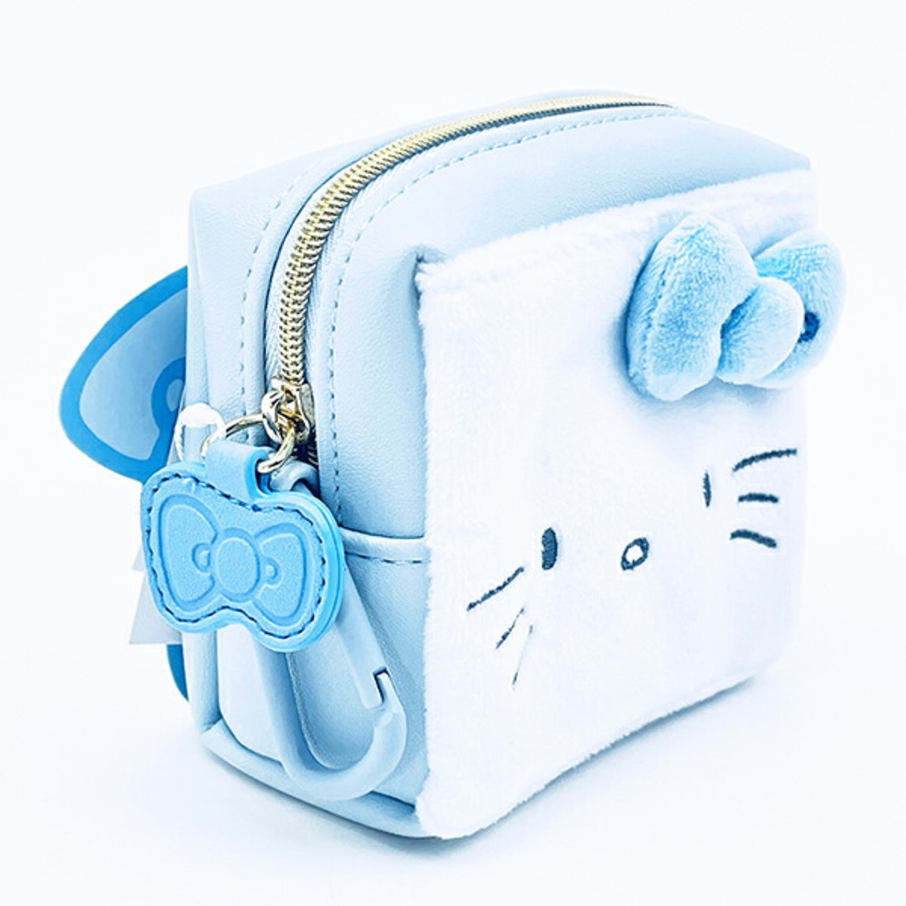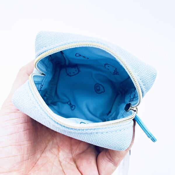 小物入れにピッタリなハローキティのミニポーチです♪カナビラ付きなのでお気に入りのカバンやリュックなどに付けられる♪珍しい水色カラー★リボンのチャーム付き◎内生地は可愛いキティのフェイスデザイン♪