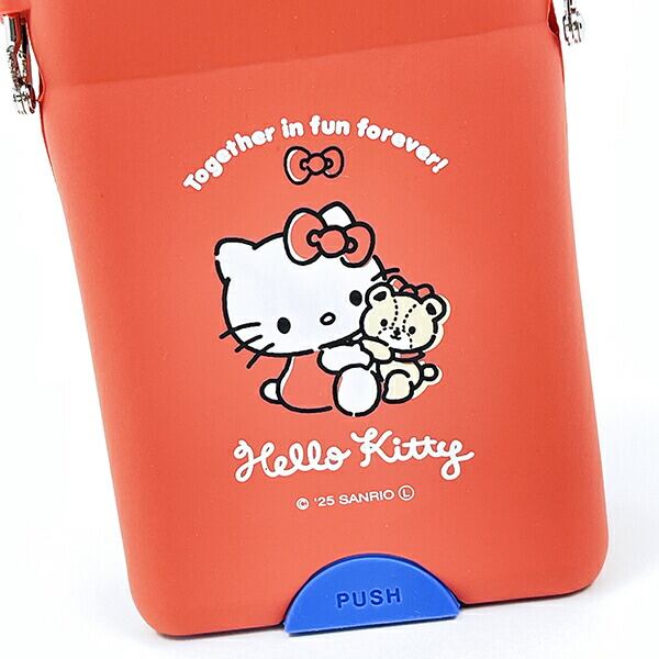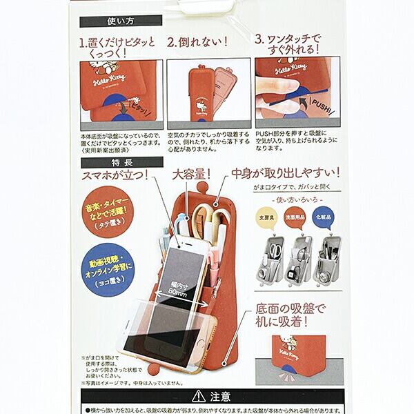サンリオのシリコーン製の縦型がま口ペンケースです♪ハローキティのイラスト入り◎表側だけでなく内側にもかわいいイラスト◎置くだけでピタッとくっつき倒れない!本体底面の吸盤でピタッとくっつき、空気のチカラでしっかり吸着します(※凹凸のないフラットな面に吸着した場合、垂直方向で3kgの引っ張り強度)。外すときはワンタッチで簡単に外れます。タテにもヨコにもスマホが置ける、大容量でガバッと開くがま口タイプ。シリコン製なので文房具以外に洗面用品や化粧品を入れるのにも便利◎デスク周りや勉強机のごちゃごちゃ感がなくなりスッキリと整理整頓できる♪