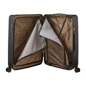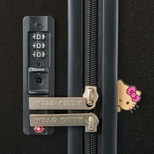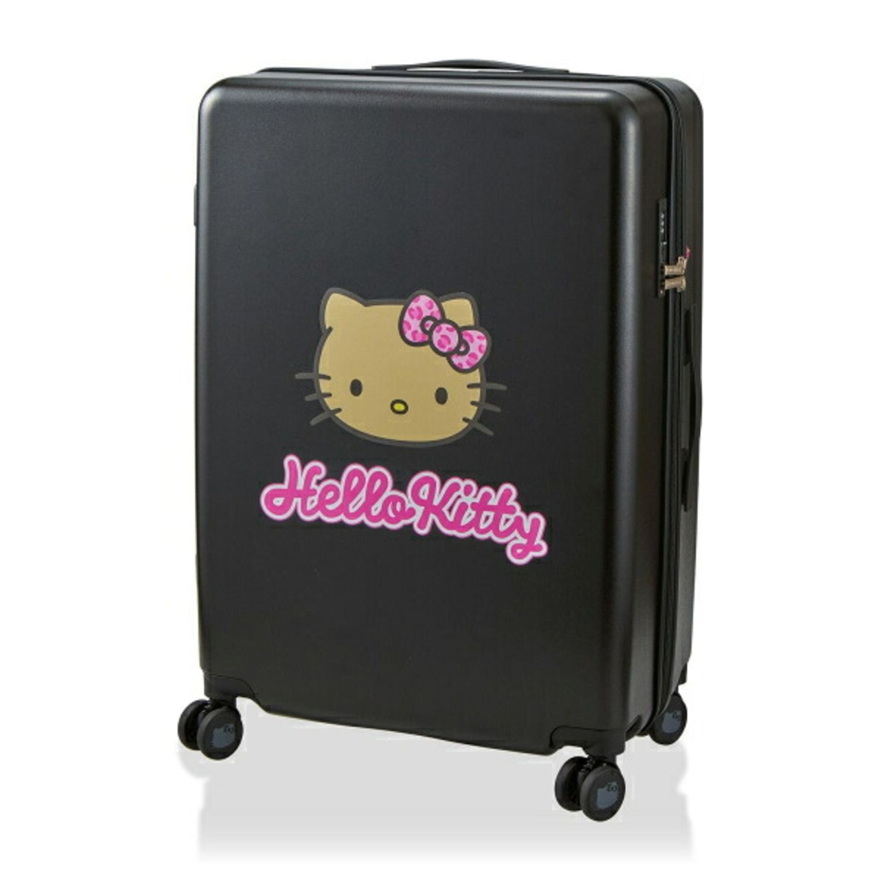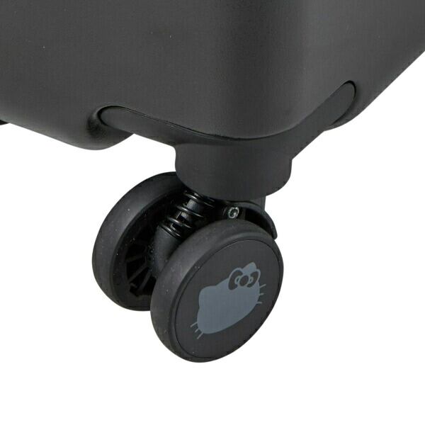 日焼けデザインのハローキティのスーツケース。日焼けデザインのハローキティがピンクのヒョウ柄リボンをつけたお顔がかわいい。スーツケースのブラックのボディに映えるピンクのロゴも大人かわいいデザインです。キャスターにはハローキティのお顔のシルエットが描かれています。スーツケース側面にはひょっこりと覗くハローキティのタグがついており、ファスナートップにはHELLO KITTYロゴが刻印されています。内装はヒョウ柄。細部までこだわったデザインです。デザインだけでなく、実用性も抜群。背面にはカップホルダー付きなのでペットボトル等を簡単に収納してスーツケースを持ち歩くことができます。内装のフタ側の間仕切りはファスナーで閉じられるので、開閉時に荷物がこぼれる心配がありません。胴側はバックル留めの間仕切りとクロスベルト仕様なのでお荷物の荷崩れを防止することができます。キャスターは安定した走行性を発揮するダブルキャスターで機能性も抜群。しかも、サスペンション付きキャスターなので、振動が手に伝わりにくく長時間移動しても疲れにくい!ロックは番号で開閉する『ダイヤルロック』タイプ。さらに、アメリカ方面への旅行時、鍵をかけたまま航空会社に荷物を預けることが可能な『TSロック』も搭載しています。【内寸:H68×W48×D28cm】【重量:約4.6kg】【容量:約83L(宿泊目安:約5〜7泊)】