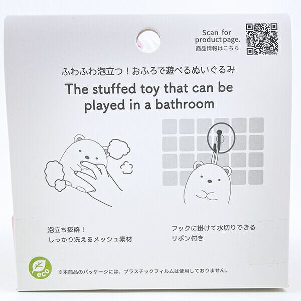 メッシュ素材で泡立ち抜群!ボディスポンジとしてもご使用できるお風呂で遊べるすみっコぐらし(しろくま)のぬいぐるみです。錆びないプラ製の鈴が入っているので、身体を洗う度に軽やかな鈴音が鳴りお子様も喜ぶこと間違いなし!ぜひしろくまと一緒にお風呂時間をもっと楽しくしましょう♪