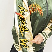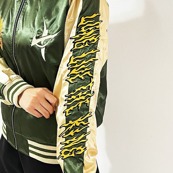 サテンの光沢ある生地で格好よく。バッグに大きくキャラクターデザインの刺繍が施されたスカジャンです。袖の部分や胸にもワンポイントが入っています。可愛くもカッコよくもコーデできちゃうアイテムです♪Lサイズですが、女性はダボっと着るのもおすすめ♪【サイズ】身丈:約58cm、袖丈:約70cm、着丈:約58cm【モデル身長:170cm】