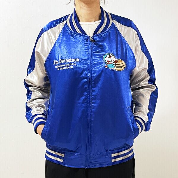 さりげない胸のドラえもん刺繍がポイント!!サテンの刺繍スカジャンです。バイカラーでオシャレ☆可愛くもカッコよくもコーデできちゃうアイテムです♪Lサイズですが、女性はダボっと着るのもおすすめです☆彡【サイズ】身丈:67cm、身巾:58cm、裄丈:85cm