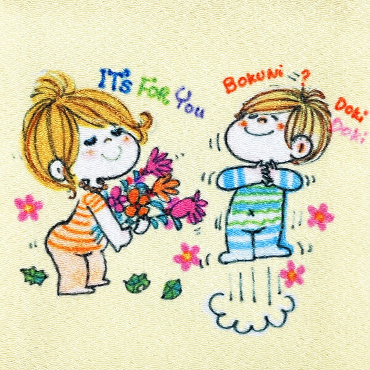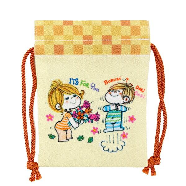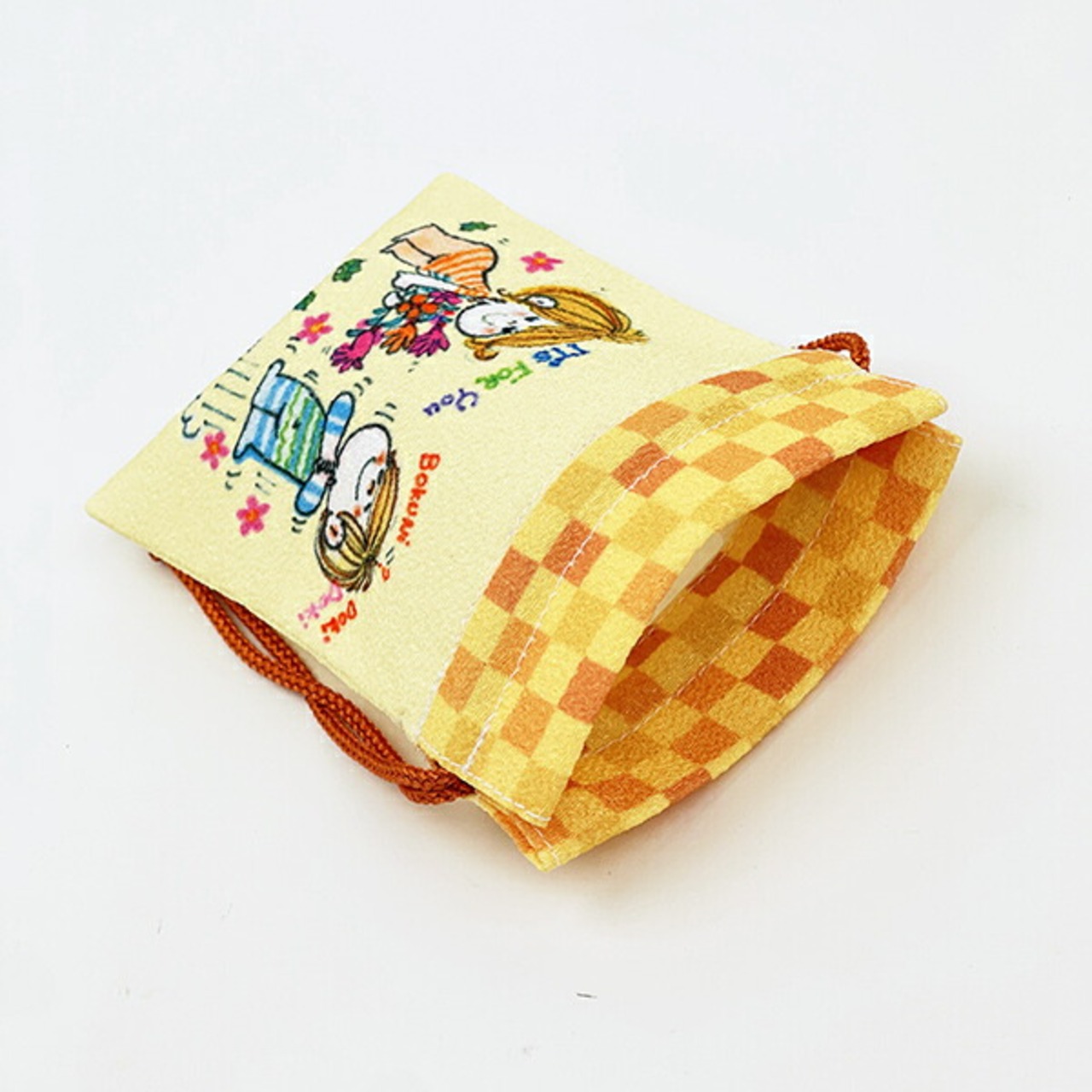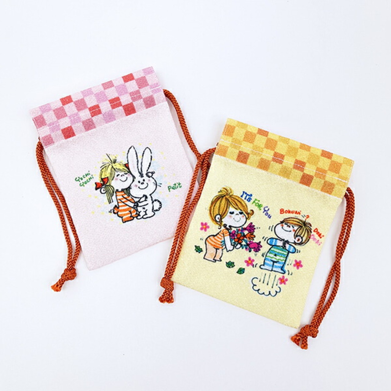 水森亜土の豆巾着です。小さめのサイズ感なので持ち運びやすく使い勝手◎年代問わずお使いいただける可愛いデザインなので亜土ちゃん好きにはたまらない〜♪プレゼントなどにも喜ばれそうです☆彡