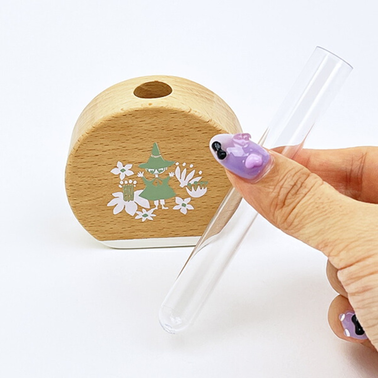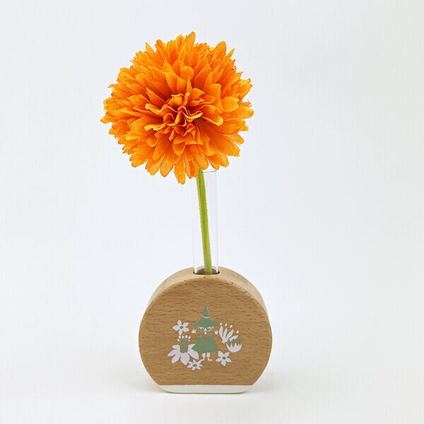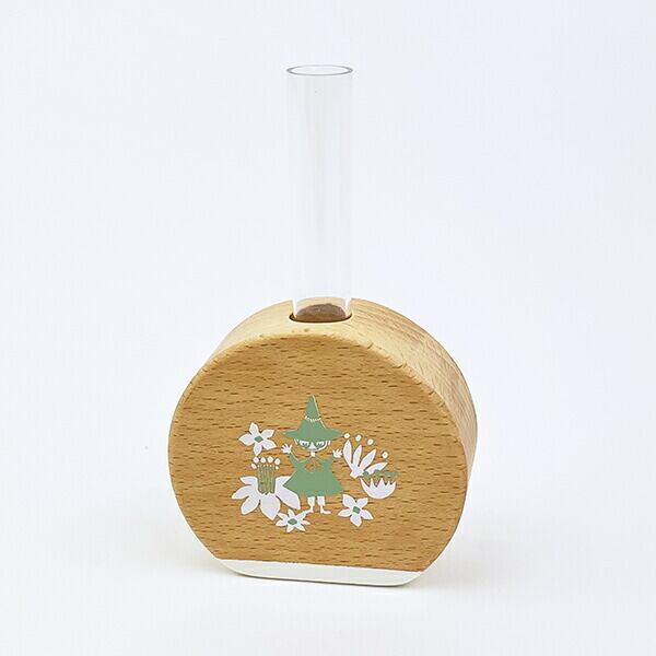 スナフキンのアートが映えるビーチ材の柔らかな質感が心地よい手のひらサイズの一輪挿しです。コンパクトなサイズなので、デスクや窓脇、玄関先場所を問わずに使用可能◎優しい風合いのアイテムなのでどんな方でも使いやすくておすすめです♪