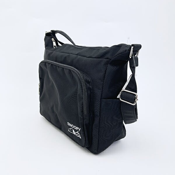 スヌーピーのショルダーバッグです♪スヌーピーの刺しゅうがワンポイントに入ってる♪マチ付きなのでたっぷり入るサイズ感♪ポケットがたくさんあるので、小物の整理もばっちり◎シンプルデザインで男女問わず使えます☆彡