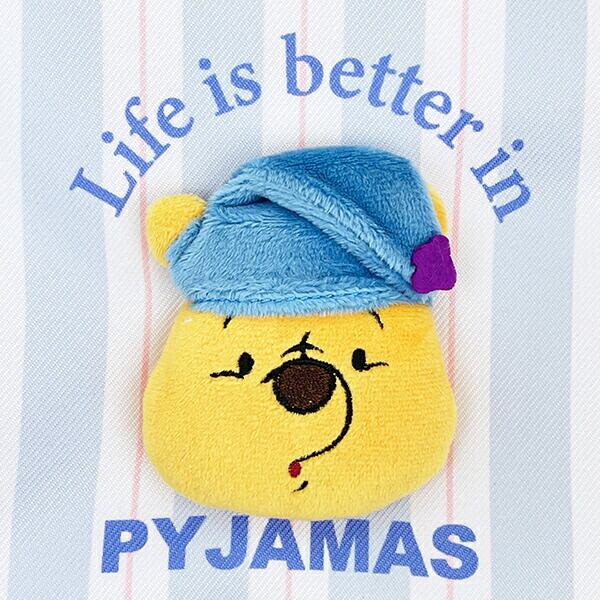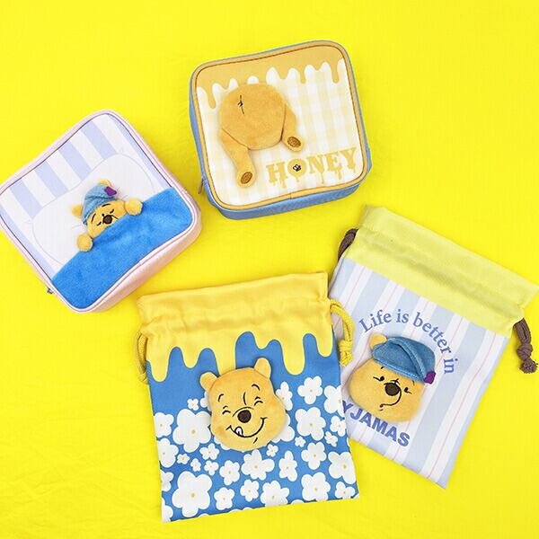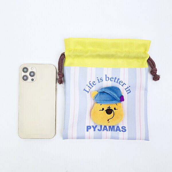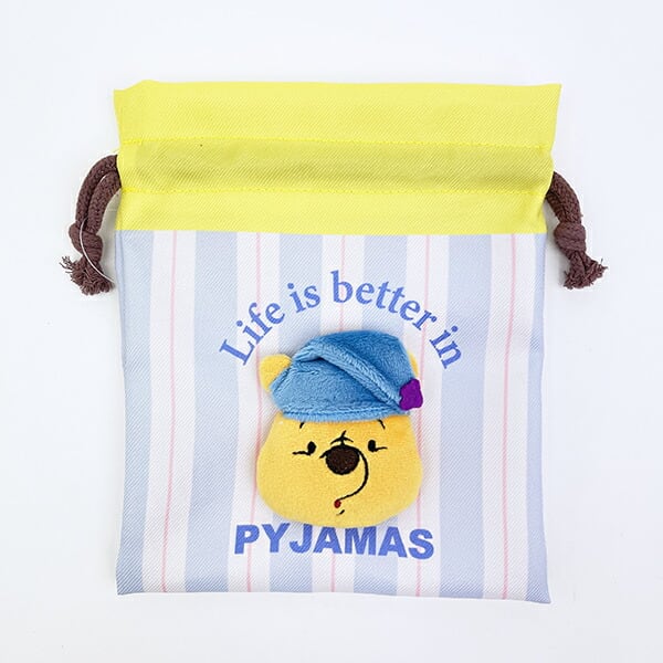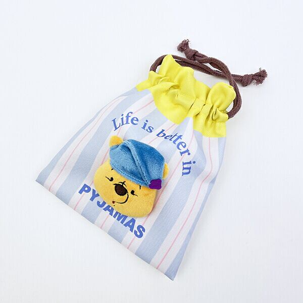 プーさんの表情がかわいいファニーフェイス柄と、帽子姿がたまらないパジャマ柄♪どちらの柄にも真ん中にプーさんのぬいぐるみがついた立体的な巾着です♪