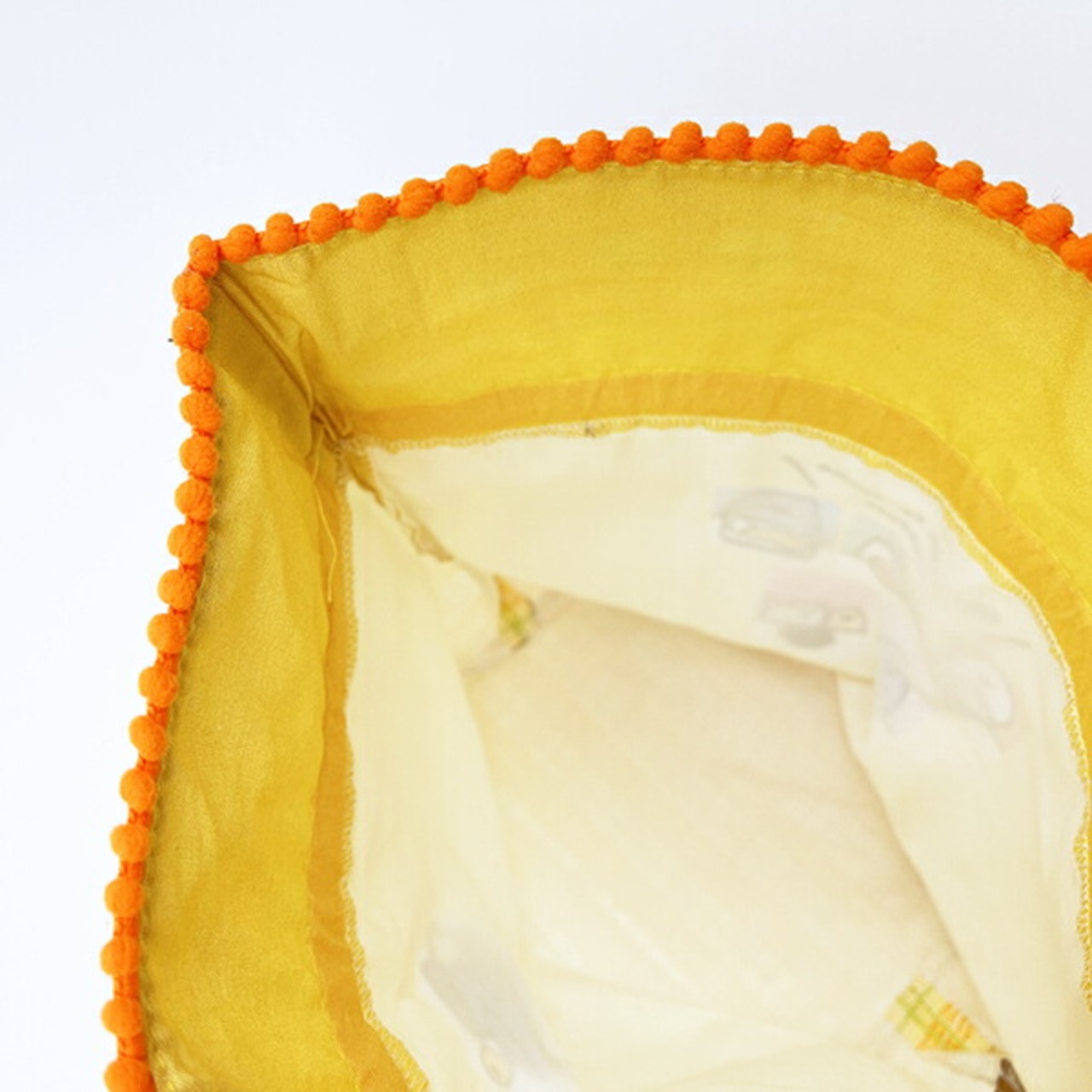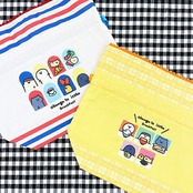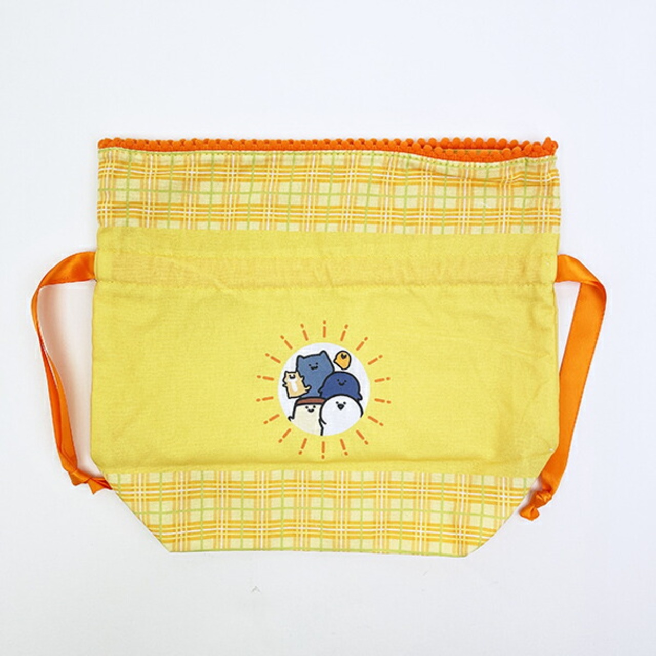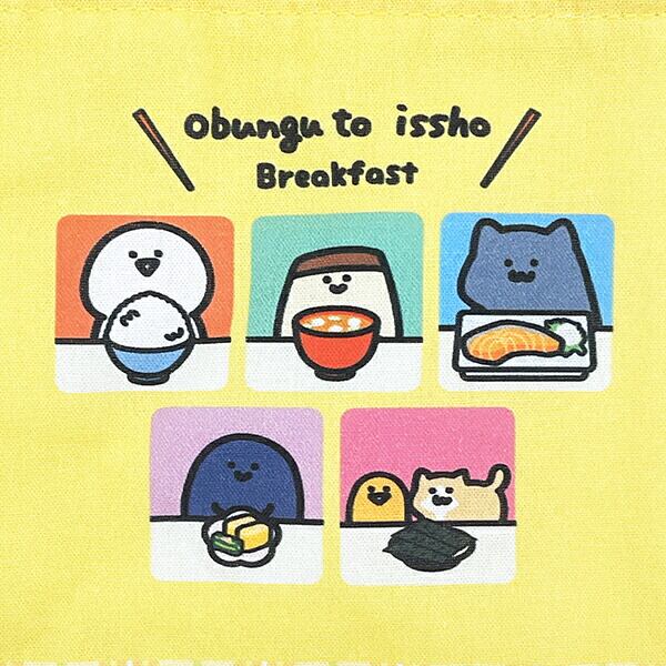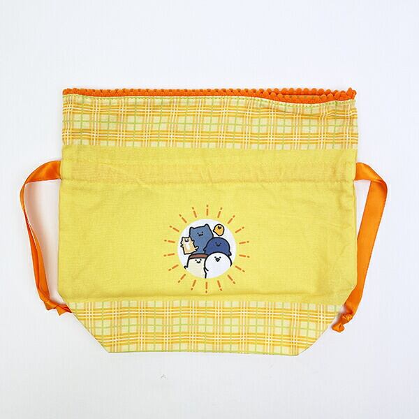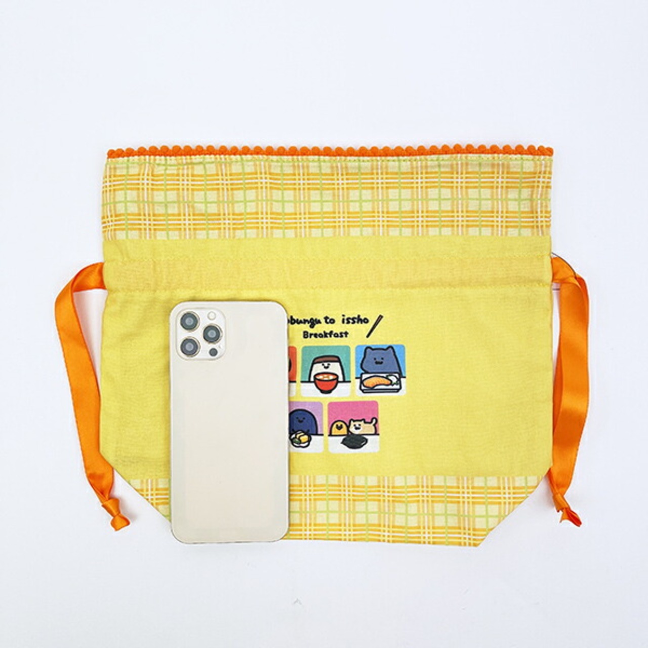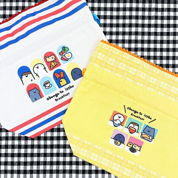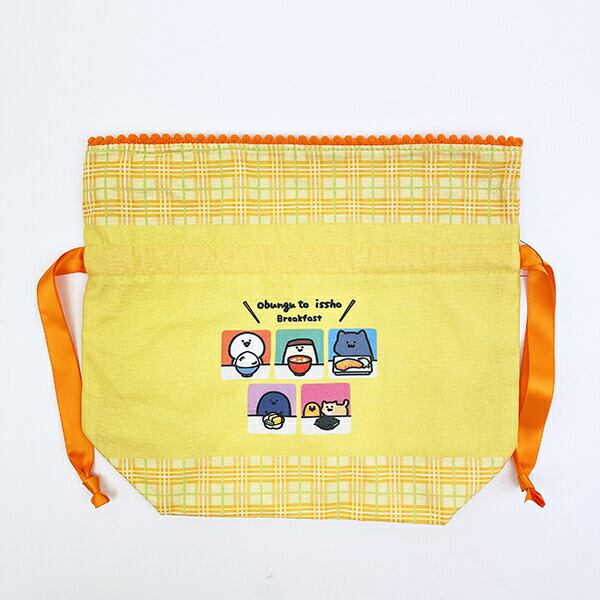 お文具さんたちが仲良く朝ごはんを食べている朝食シリーズです♪元気をもらえるカラーリングで、開け口にポンポンがついたほっこりかわいいマチ付の巾着♪