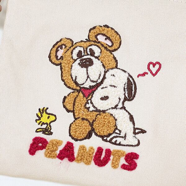 スヌーピーの巾着です♪ベアをハグしているスヌーピーがとってもキュート♪サガラ刺しゅうのデザインも◎ナチュラルカラーで飽きがこないデザイン♪小物入れにとっても便利☆彡