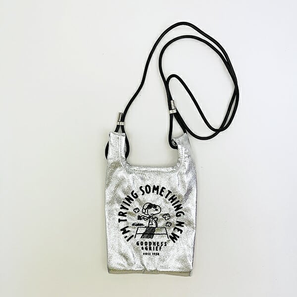薄手で軽い、クラック調のメタリック素材を使用したスヌーピーのショルダーバッグです。トレンドのシルバーカラーで遊び心をプラス♪ミニサイズのショッパー型デザインが可愛い☆スマホとハンカチでちょっとしたお散歩時やメインバッグとの2個持ちなどにぴったり◎長さ調節可能なショルダーベルト付きなので両手フリーでアクティブに♪背面のルーポケット付きが嬉しいポイント☆PEANUTS75周年を記念する織りネーム付き。毎日のお出かけをもっと楽しくできちゃう大人の「スヌーピー」デザインのルートートです☆彡【サイズ】平置き時:W14.5×H(中央部分)18(持ち手込)24.5×D11cm【ショルダー:最長約130cm】