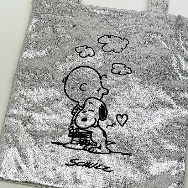 薄手で軽い、クラック調のメタリック素材を使用したスヌーピーのトートバッグです。トレンドのシルバーカラーで遊び心をプラス♪可愛いサイズのミニトート「べビールー」。ミニ財布、スマホ、ハンカチ、必要最低限の荷物がすっきり収まります!ちょっとそこまでのお出かけにぴったり☆フラットな形状なのでバッグインバッグやポーチ代わりにも◎背面の2口のルーポケット付きが嬉しいポイント☆PEANUTS75周年を記念する織りネーム付き。毎日のお出かけをもっと楽しくできちゃう大人の「スヌーピー」デザインのルートートです☆彡【持ち手:42cm】