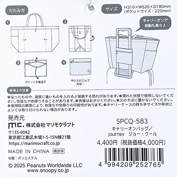 旅行先で増えた衣類などの荷物を入れるのにとっても便利なスヌーピーのキャリーオンバッグです。旅行の時はコンパクトに畳めるのでかばんに入れておくと安心ですよ♪キャリーケースのハンドル部分に取り付け可能◎【ポケットサイズ:220mm】