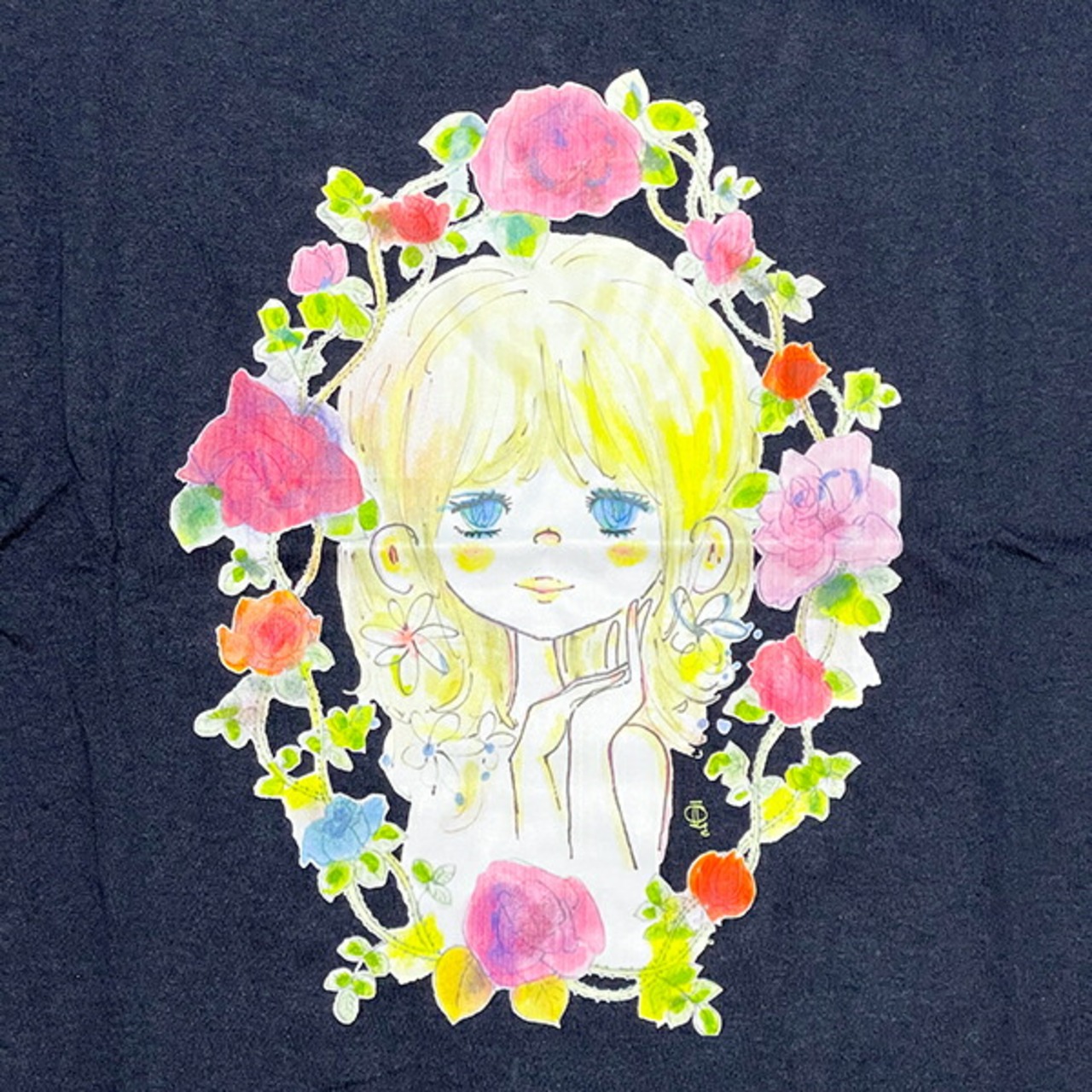 水森亜土 お花の少女柄 プリント半袖Tシャツ(L) ネイビー アパレル