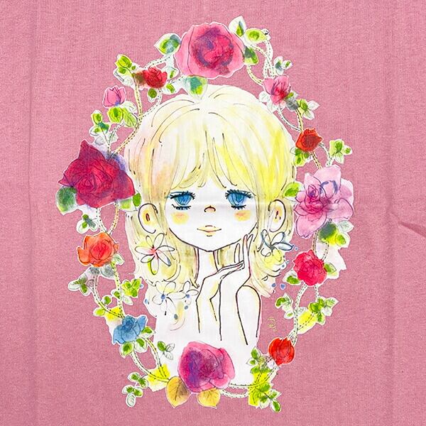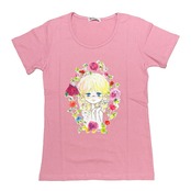 水森亜土 お花の少女柄 プリント半袖Tシャツ(M) ローズピンク アパレル