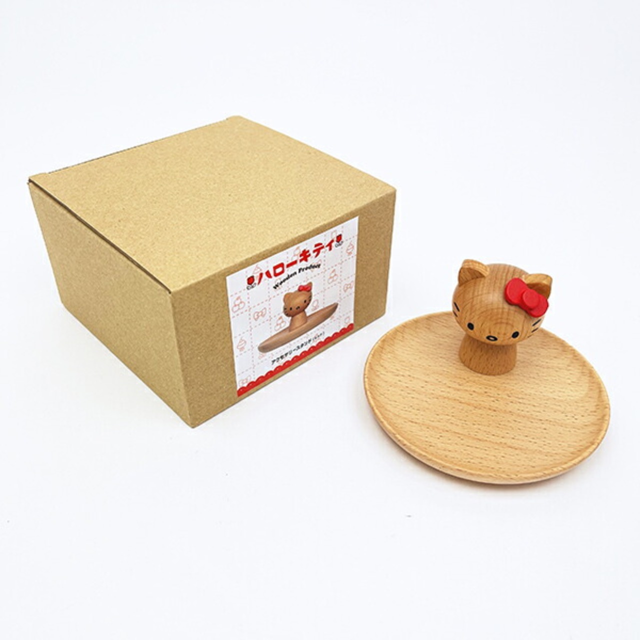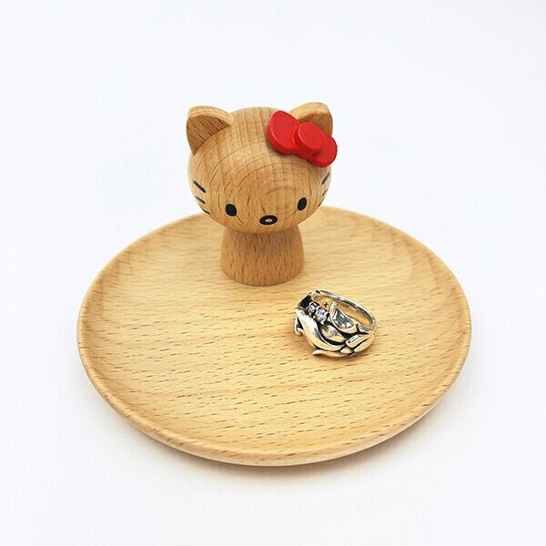 キティちゃんの天然木のアクセサリースタンドになります。お皿の直径は約10?です。 お皿にネックレスやブレスレット、キティちゃんの耳にリングをかけて可愛く飾ることが出来ます☆彡 シリーズで揃えたくなる〜♪