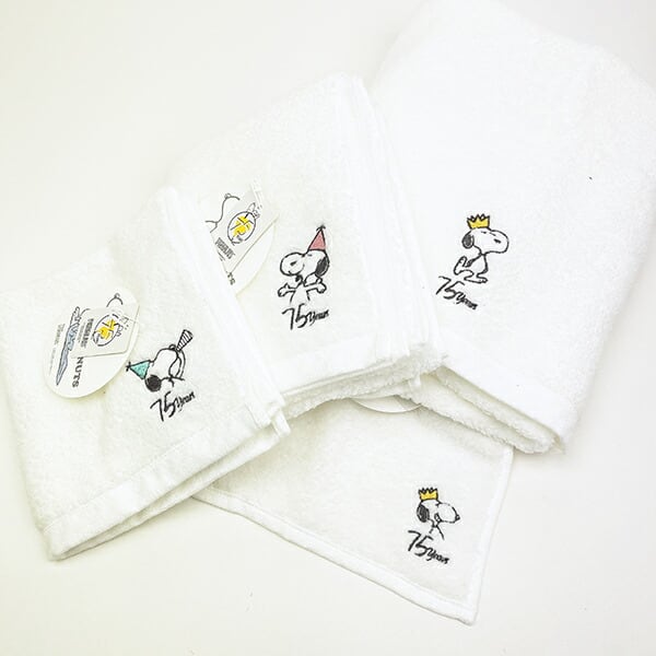 スヌーピーのバスタオルです♪王冠を被ったスヌーピーの75周年限定デザインがとってもキュート♪綿毛のようにふわふわ柔らかく軽くて綿100%なので、赤ちゃんにも安心して使えますよ♪スヌーピーと一緒に周年をお祝いしましょう☆彡