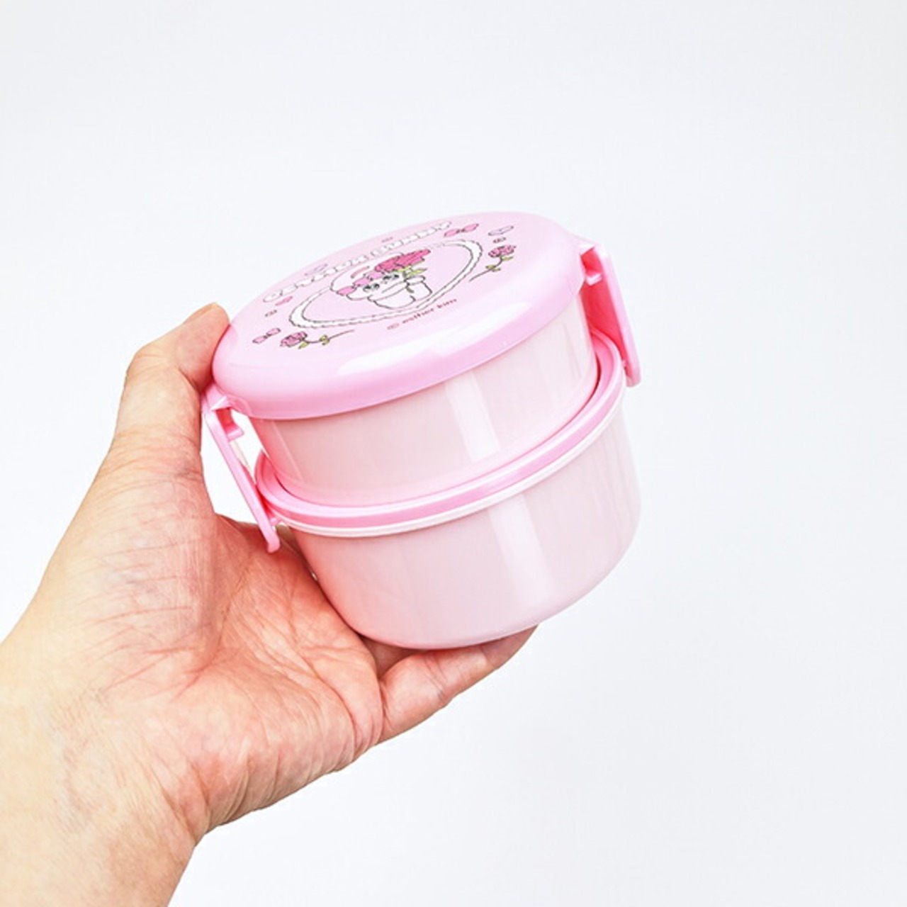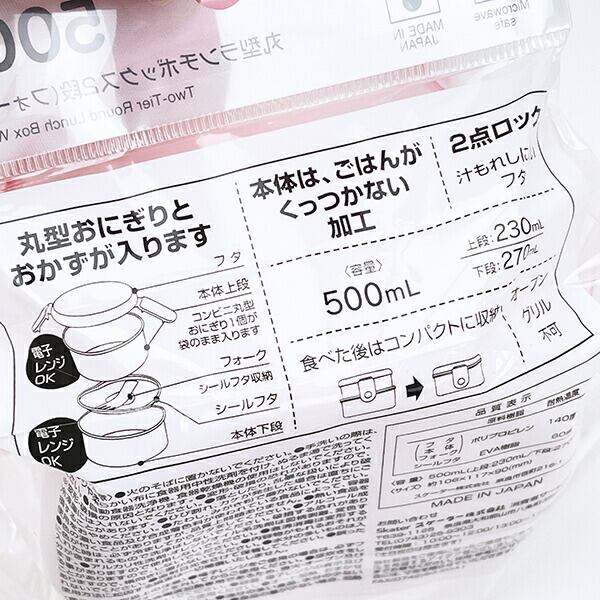 韓国系アメリカ人であるEsther Kim氏がデザインした、POPでガーリーなテイストのウサギのキャラクターの丸型ランチボックス2段(フォーク付)です。コンビニの丸型おにぎり1個が袋のまますっぽり入ります♪上段下段とも、ごはんがつきにくい「くっつかない加工」が施されています。内蓋収納フォーク(プラスチック製)付き♪食べ終われば1段にコンパクトに収納できます!エスターバニーのランチアイテムなどと揃えれば、ランチタイムも楽しくなっちゃいそうです☆彡※ロック式ですが、パッキンは付いていませんので汁気のある食材はお避け下さい。※電子レンジ使用可◎【容量:上段230ml、下段270ml】