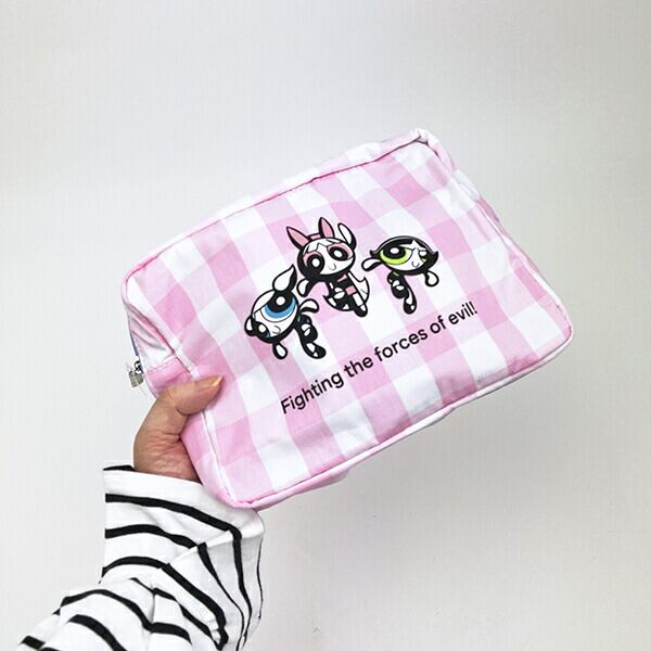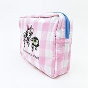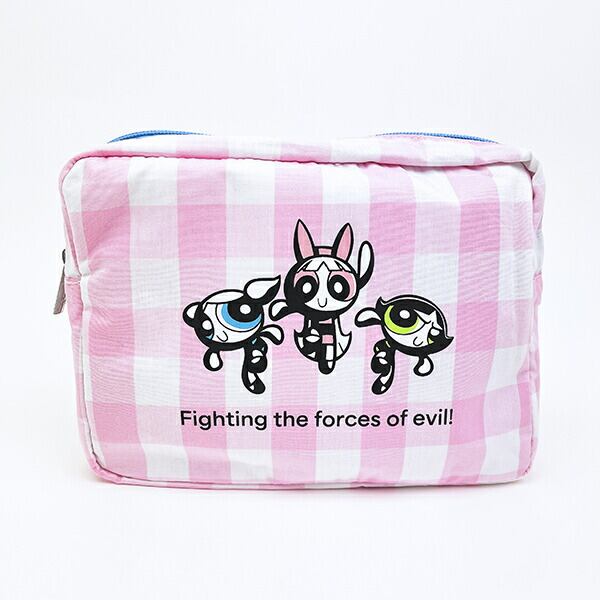 パワーパフ ガールズのギンガムチェックポーチです。大きめのポーチなのでメイク用品やガジェット類を入れるのはもちろん、トラベルポーチとして使用したりと使い勝手◎同シリーズのトートバッグとセットで持つと可愛さMAXです☆彡