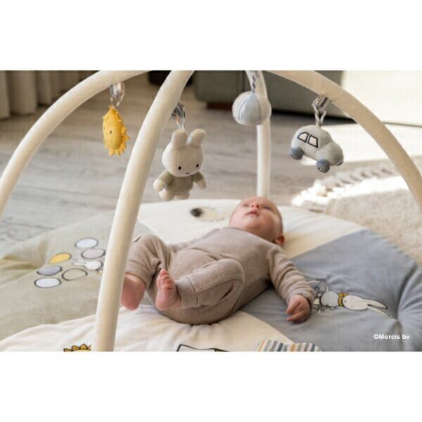 ミッフィーたちの4種のおもちゃがついたジム。お腹を押すとキュッキュ音が鳴るミッフィー、カラカラ音が鳴るくるま、カシャカシャ音が楽しい太陽、鈴の音がキレイなミラー付きボール。それぞれのおもちゃは取り外しができます。マットにもカシャカシャやミラー、かくれんぼ等のしかけも。ポールは取り外しができてマットとしてもお使いいただけます。 ミッフィーが生まれたオランダでデザインされた、赤ちゃんのためのミッフィー。●洗濯機で洗えます。●製品の洗濯表示に従ってお手入れしてください。●アルコール成分を含む除菌シート等で製品を拭かないでください。変色、変形するなど製品が劣化する可能性があります。【対象年齢:おたんじょうから】
