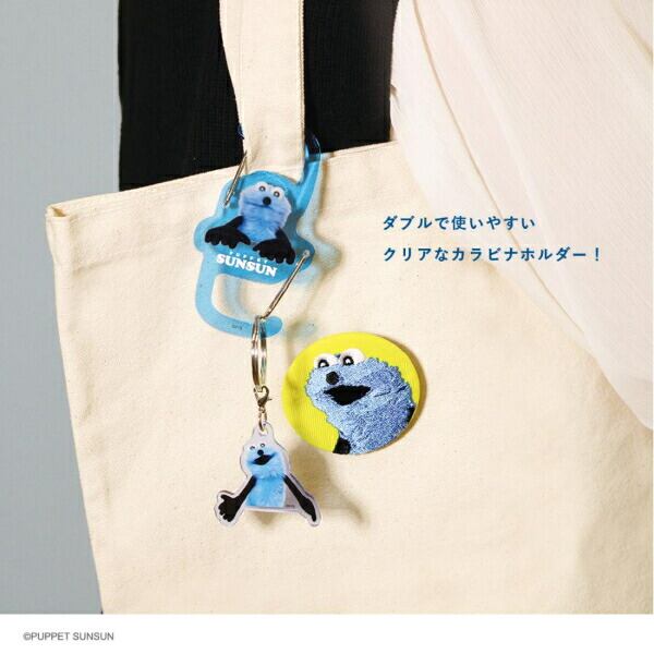 パペットスンスンのツインカラビナホルダーです。ダブルだから使いやすい♪バッグなどに付ければスンスンと毎日一緒におでかけできちゃいます☆クリアでおしゃれなのが嬉しいポイント♪スンスンのマスコットやキーホルダーを付けてぜひスン活しましょう☆彡