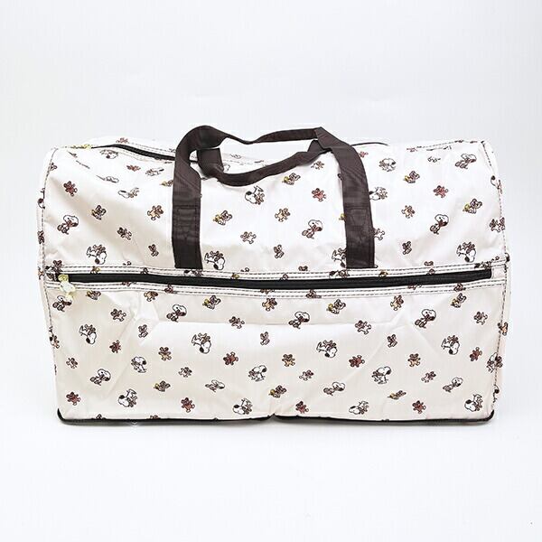 スヌーピーの普段使いから旅行用まで、幅広く使える軽いボストンバッグです♪容量約38LでスーツケースSサイズと同等の容量です。約1〜3泊のご旅行におすすめ。使わないときはコンパクトに折りたたんで収納し、使いたいときにぱっと広げて使えます。バッグ背面にはスーツケースのキャリーバーに通せるようにキャリーバー通しが付いているので、旅行の際はとっても便利。バッグの開口部はファスナーで閉じられるので中身がこぼれる心配がありません。バッグ前面と側面にはポケットもついているので、小物を収納するのに便利です。さらに内装にもポケットが付いています。また、取り外し可能なショルダーベルト付きなので、肩に掛けて持ち運ぶこともできます☆彡