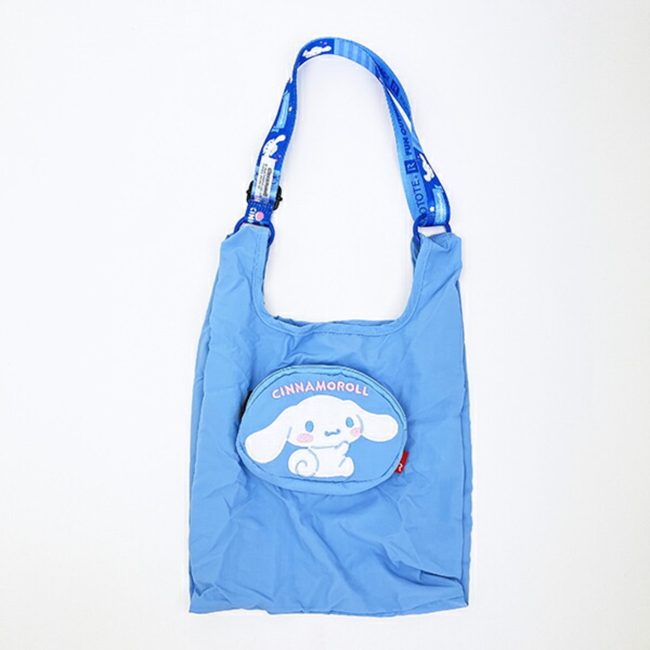 シナモロールのショッパー型デザインのトートバッグです。長財布、スマホ、ボトル、A5ノート、ポーチなどが収納可能◎取り外し&長さ調整可能な、両面プリントのショルダーベルト付きなのでシーンに合わせて、手持ち・肩掛け・斜め掛けと使い分けができて便利♪振り向きポーズの刺繍が可愛い真ん中のポケットも小物を入れるのにぴったり☆使わないときは、このポケットをひっくり返してショッパー本体を収納すれば、もふもふのキャラクターフェイスに早変わり!!コンパクトに持ち運びができちゃいます☆背面のルーポケットはスマホなど出し入れの多いアイテムの収納に便利です♪【サイズ】平置き時:約W25.5×H(中央部分)27.5(持ち手込)37.5×D9cm、ショルダー最長:約85cm、収納時:約W16.5×H12×D4cm