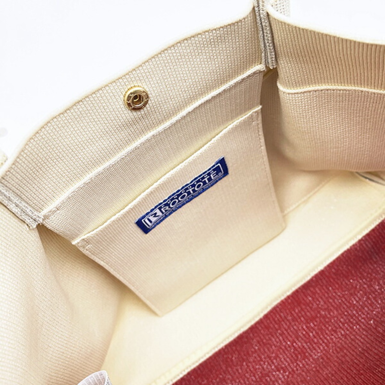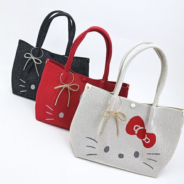 ハローキティの素材をフル活用したルートート「ルフル」。お財布、ボトル、A5ノート、ポーチなどがらくらく収納できて見た目以上のたっぷり容量がgood♪キラキララメ入りの糸で編まれた本体はサラリとした手触りでニットなのにハリがあり、自立するのも魅力です☆取り外し可能なリボン型のチャーム付きが嬉しいポイント♪きらめくラメとリボン、これからのホリデーシーズンにもぴったり☆持っているだけで華やかになること間違いなしです☆彡